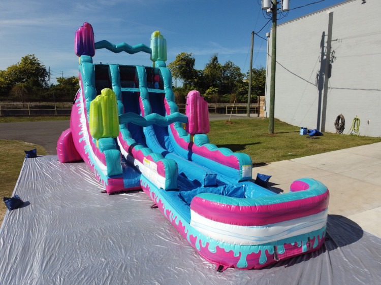 The slide's lofty height delivers long, exciting descents, while the dual lanes increase throughput so more guests can ride without long waits. Constructed for rental use, it’s built to be durable and safe for repeated sessions: wide climbing steps and secure sidewalls help riders reach the summit, and deep landing areas cushion the finish. Vibrant, freeze-pop–inspired colors and theming add seasonal charm and visual pop that draws attention in any event space.