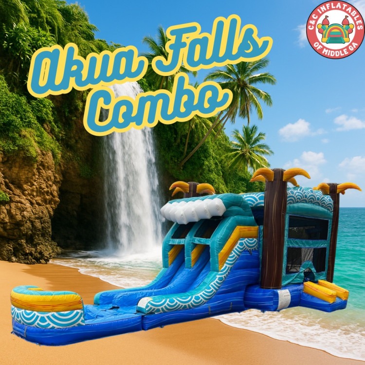 Akua Falls Dual Lane (wet/dry) — a twin‑lane inflatable waterfall slide where two racers can go side‑by‑side, switching between a wet splash‑pool finish or a dry, all‑season slide.